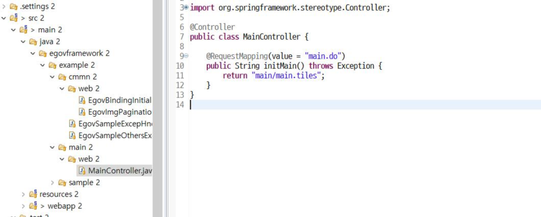 Controller를 확인하면 main/main.tiles를 적용시켜놓았음 확인