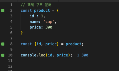 {} 구문 안에 변수를 선언하고 객체를 대입하면 해당 프로퍼티의 값이 할당된다.