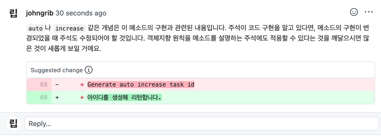 주석을 추상적으로 적지 않고 코드 구현을 담고 있는지 고민해볼것