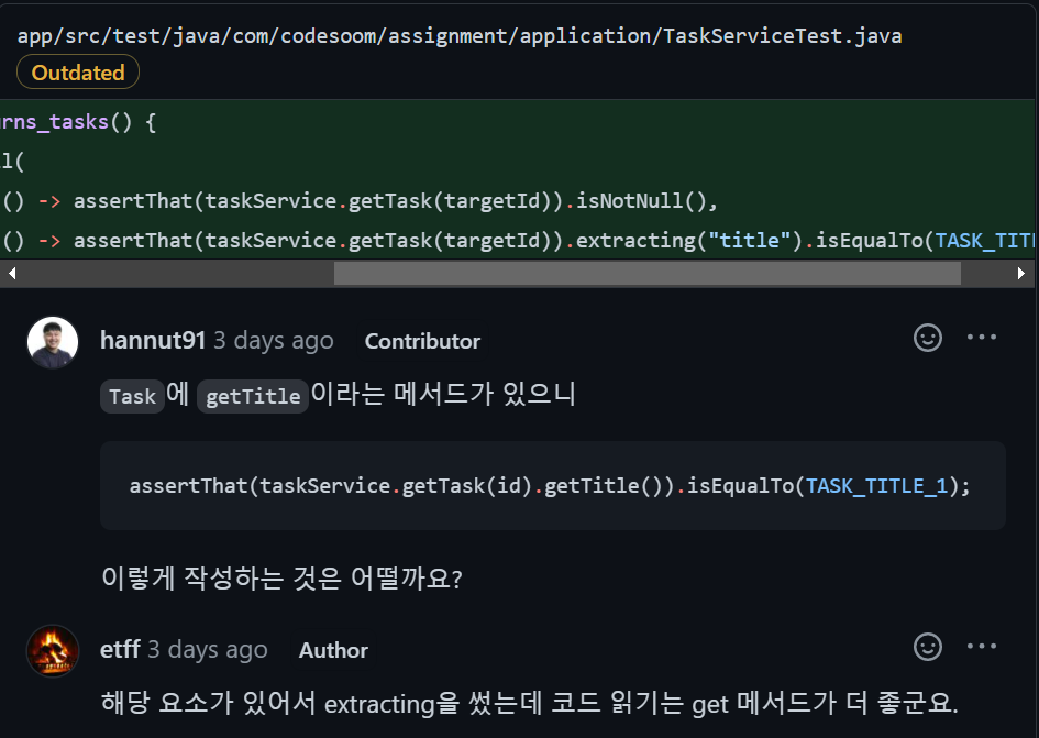 예를 들면 assertJ의 extracting 기능이 있으니 써보자고 생각했는데 막상 코드 읽기는 별로였다.