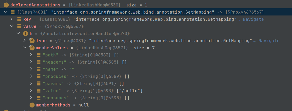 이때 추출된 method 정보에 delaredAnnotations 정보도 나온다. 여기서 value=> memberValues을 확인하면