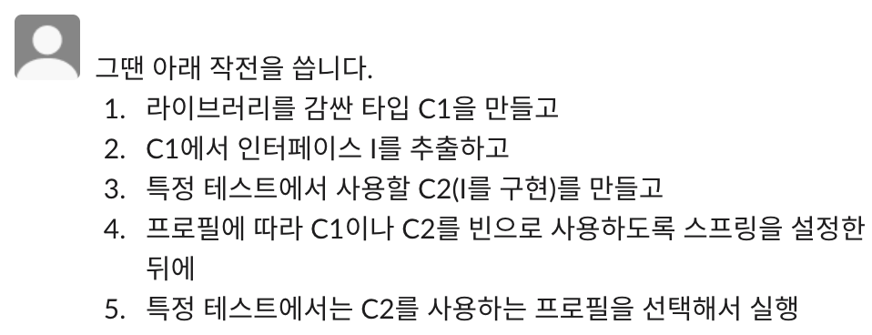 추가적으로 스프링을 사용하면 스프링 프로파일 활용해 런타임 의존성을 교체할 수 있을 것 같다.