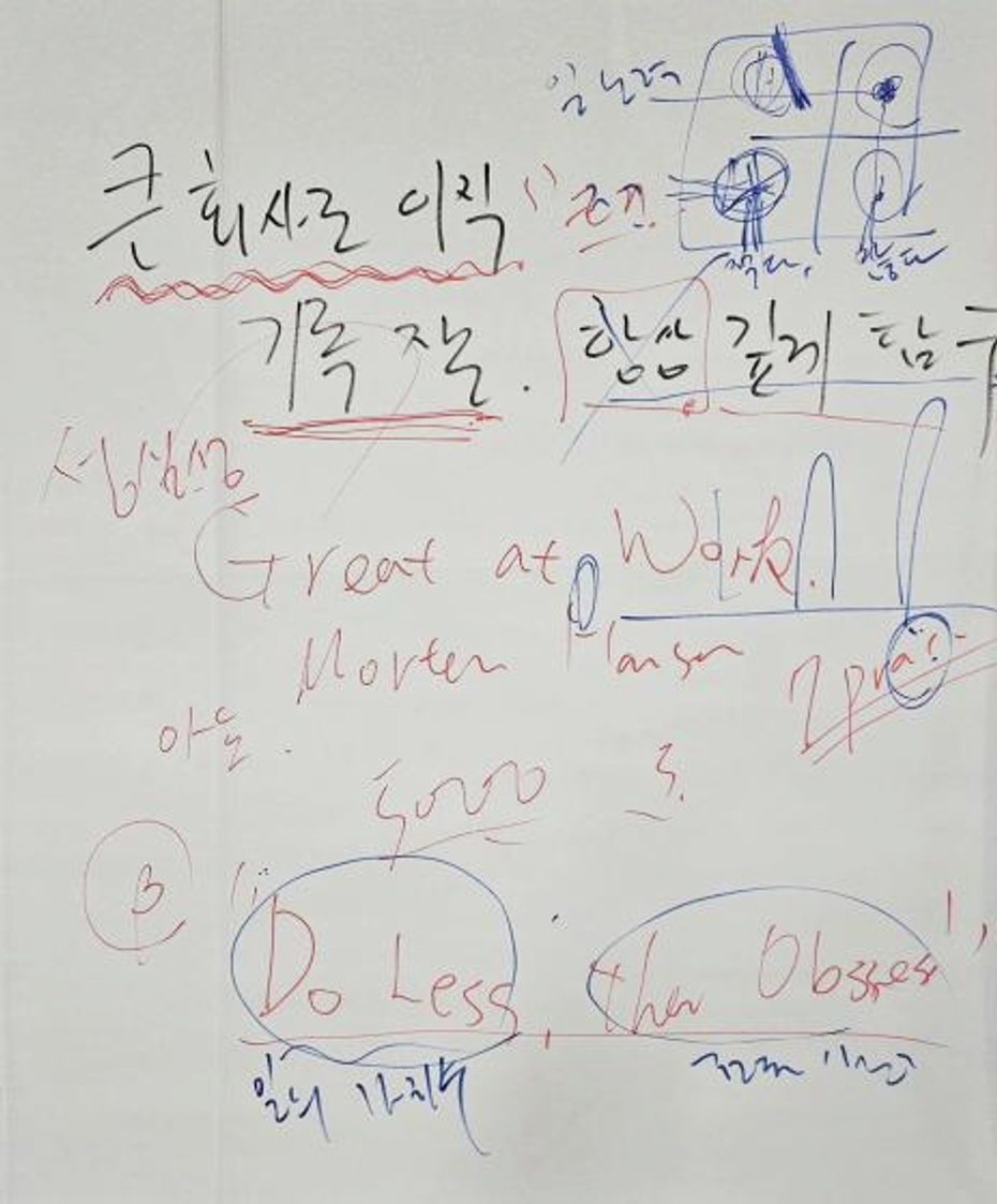 성과를 잘 내는 사람의 가장 핵심은 일을 적게 한다. 대신 그것을 열심히한다. 선택적으로 깊게한다. 일할때 몇가지만 집중을 하는가. 이런 사람들이 퍼포먼스가 높다.