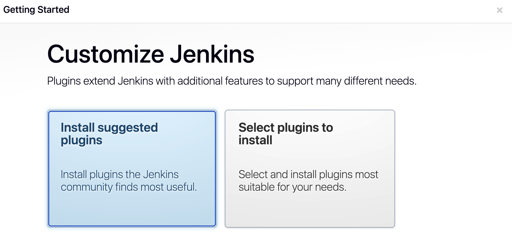 Jenkins 웹 접속: http://127.0.0.1:8080에 접속하여 초기 암호를 입력하고 "Install suggested plugins"를 선택합니다.