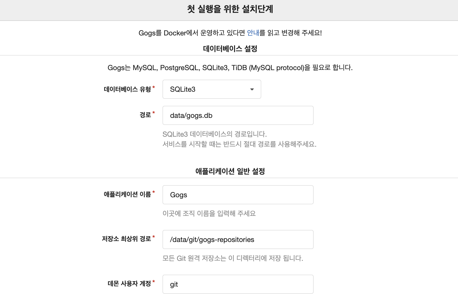 - ports: - "3000:3000": Gogs의 웹 UI 접근 포트입니다.
